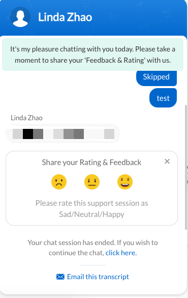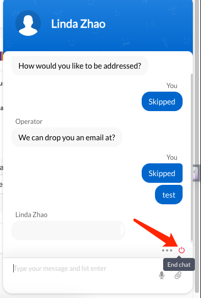 You will need to provide your valid email address for follow-up on any unfinished chats. When you wish to end the current conversation, you can simply click on the "End Chat" button in the bottom right corner and provide feedback.(optionally)